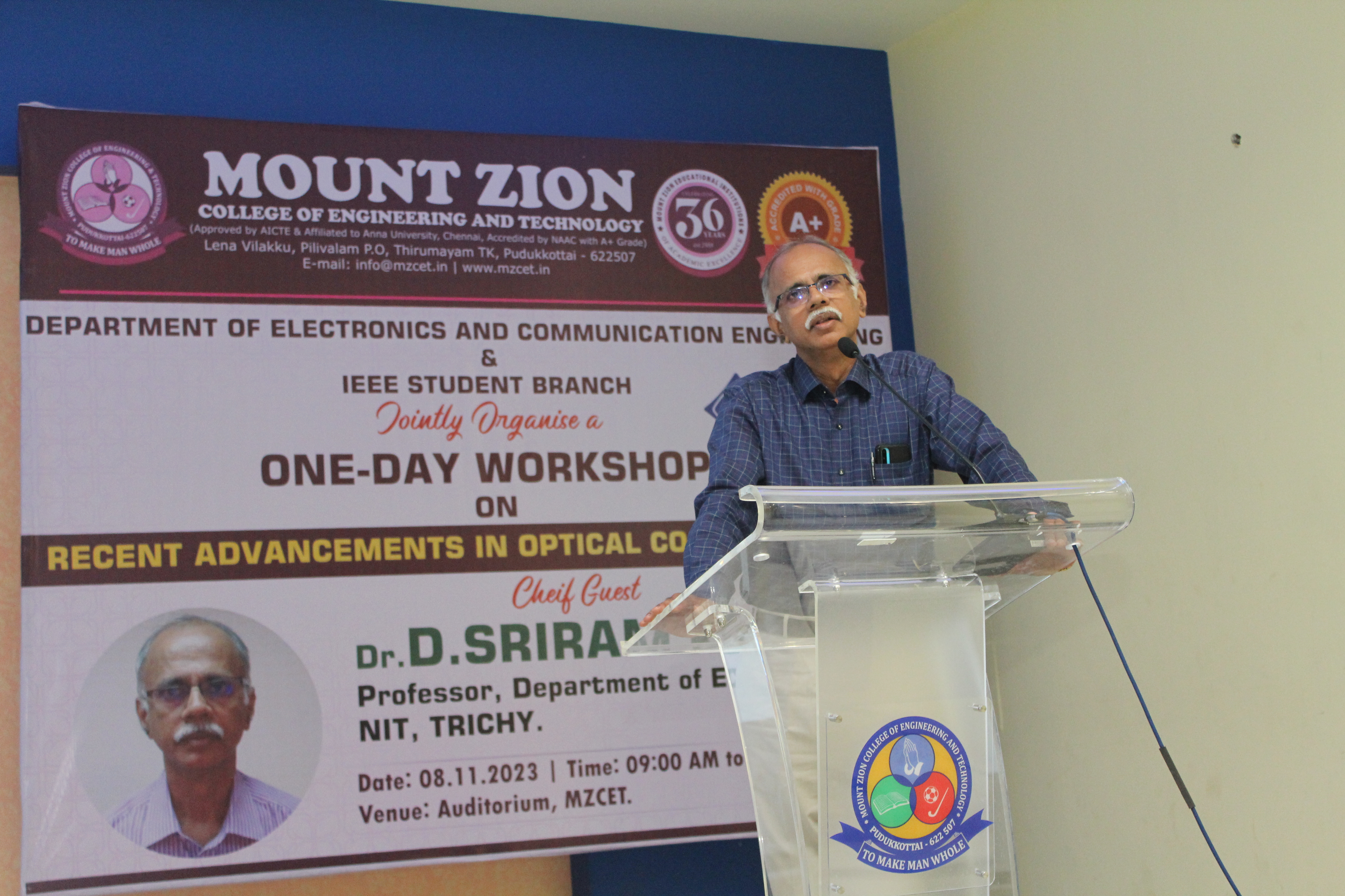 | 6 | 08.11.2023 | Oneday Workshop on "Recent Advancement in Optical Communication" | I,II, III & IV- ECE | 205 | Dr.S.Robinson, Dean/ICT, /td> | Dr. D.Sriram Kumar, Professor, Department of ECE, NIT, Trichy. |
